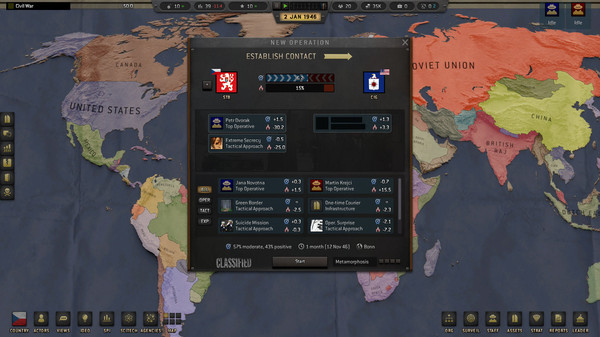 Espiocracy, developed by Ex Vivo Studios, published by Hooded Horse. This game have is Simulation, Strategy category. Espiocracy is an espionage grand strategy game where you lead the intelligence agency of one of 74 playable countries. Rewrite history from the shadows as you influence ideologies, stage coups, and wage proxy wars. Subterfuge takes center stage as you establish a new world order.