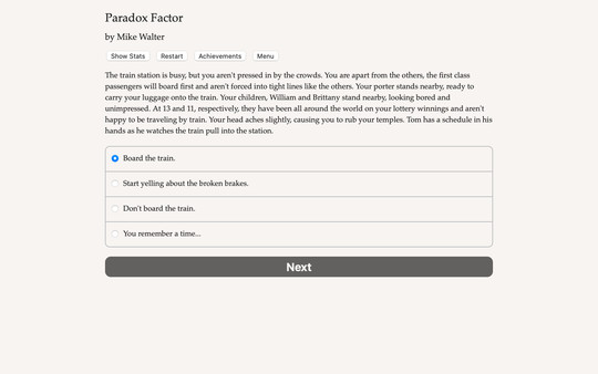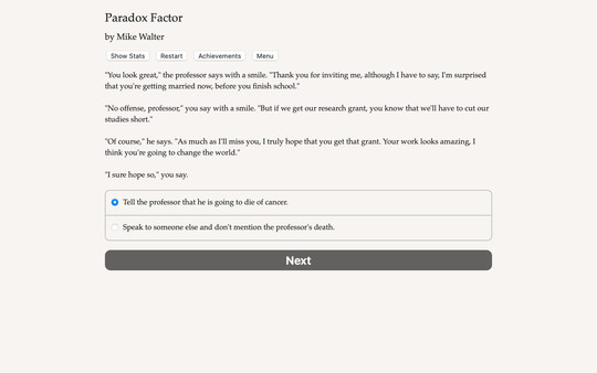 Paradox Factor, developed by Hosted Games, published by Hosted Games. This game have is Casual, Indie category. Alter your past and future in this thought-provoking and edgy time travel game. Are you willing to live with the effects that your changes may cause?